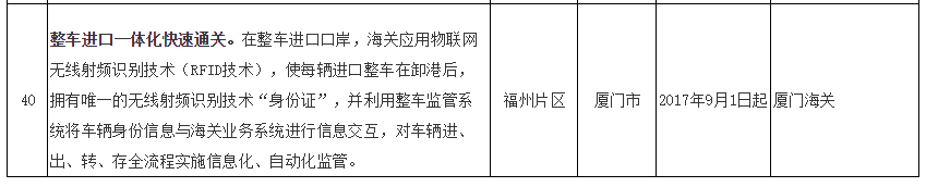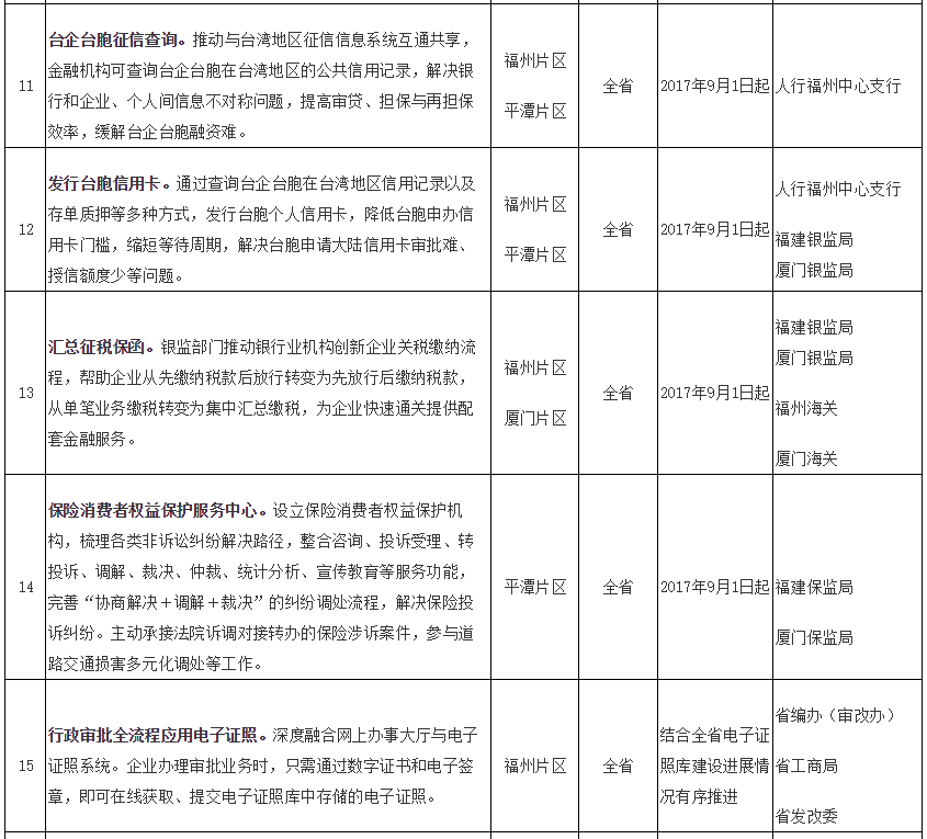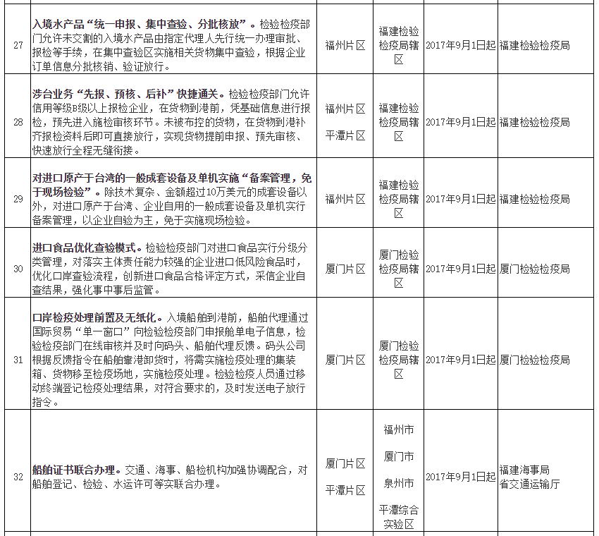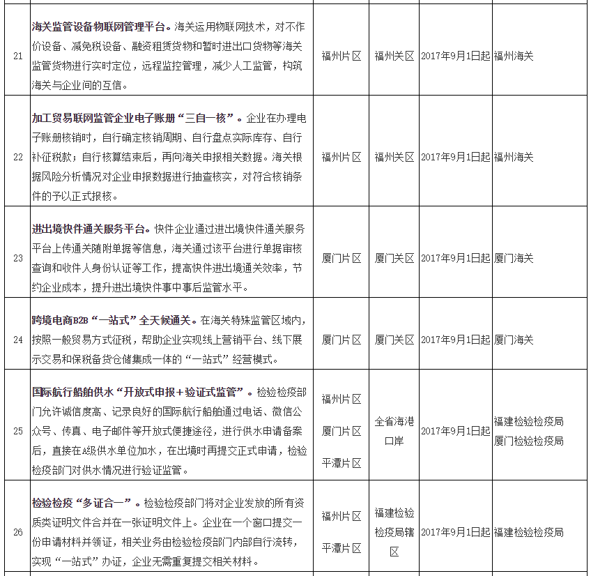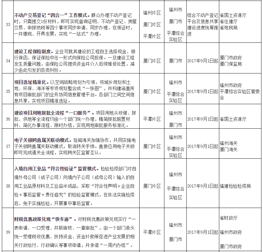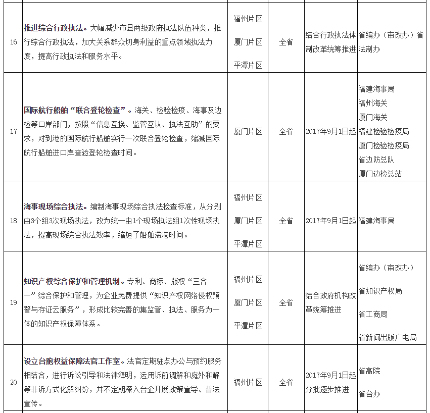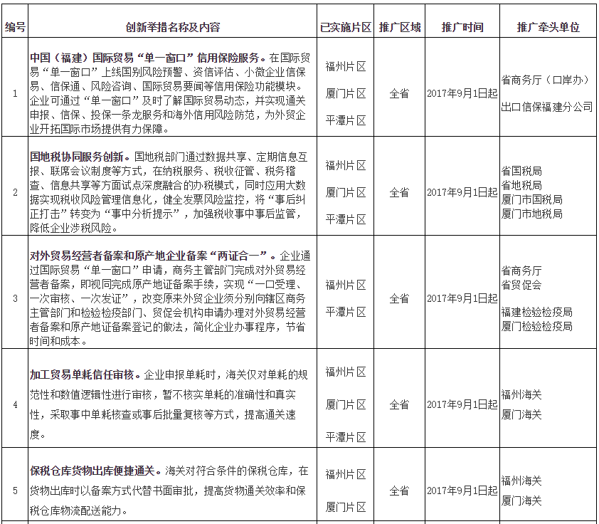 福建自贸试验区第五批创新成果复制推广任务分工表