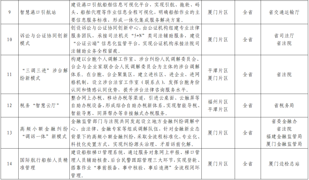 福建自贸试验区第十批制度创新成果复制推广任务分工表