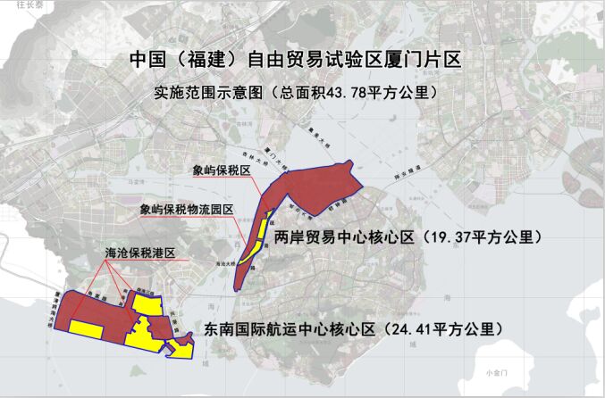 中国(福建)自由贸易试验区厦门片区总面积43.78平方公里。包括两个区块:两岸贸易中心核心区19.37平方公里;东南国际航运中心海沧港区24.41平方公里。