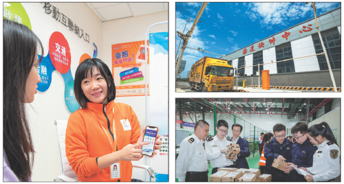 Clockwise from left: A staff member introduces internet services on cross-Straits communication to a customer in Fujian. A freight truck stops at an express delivery station in Fujian. Staff members of Xiamen Customs check the exported goods of an enterprise.