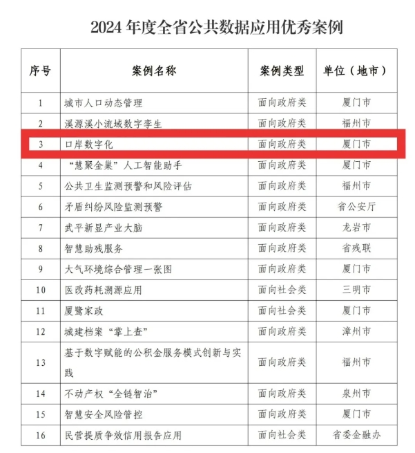 近日,福建省数据管理局公布2024年度全省公共数据应用优秀案例,厦门自贸片区管委会申报的“口岸数字化”获评2024年度全省公共数据应用优秀案例。