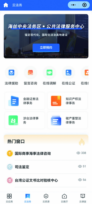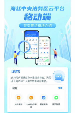 11月18日,海丝中央法务区云平台移动端正式上线,“五朵云”功能亮相,即云应用、云法务、云课堂、云展厅、云资源,打造全时空全要素的公共法律服务线上平台,提供一站式便捷法律服务,实现“掌上办”“指尖办”“随时办”,满足广大企业和群众对法律服务的新需求。截至11月底,云平台移动端共汇聚了2030家法务机构,聚集了87家律师团队,对接法律数字产品16个,开设36项常用智能化法律服务,提供金融、知识产权、破产、涉台4大垂直领域的一站式服务,各项服务功能已陆续呈现,“云上法务区”初具规模。