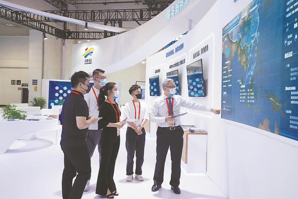 李南(右一)在介绍“丝路海运”的历程。