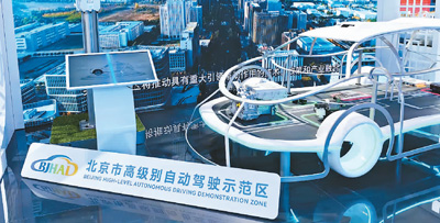 中国自由贸易试验区建设十周年成就展上,北京市高级别自动驾驶示范区展示了自动驾驶样车和设备模型。汪文正摄