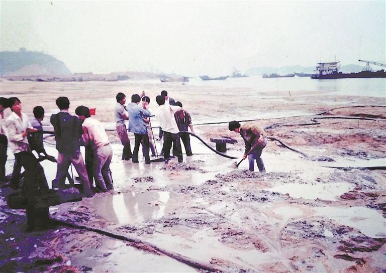 1989年 海天码头(东渡港区二期)兴建之初,工人在大片滩涂上肩扛手拽挥洒汗水。