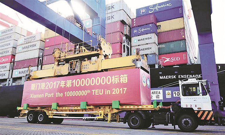 2017年,厦门港年吞吐量达1038万标箱,成为福建省首个千万标箱大港,完成向干线港、枢纽港的“蝶变”;去年,厦门港完成吞吐量1243.47万标箱,是世界排名第十四位的“东方强港”。