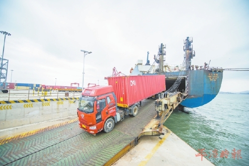 货车装载着货物从台北快轮上驶出。(资料图)