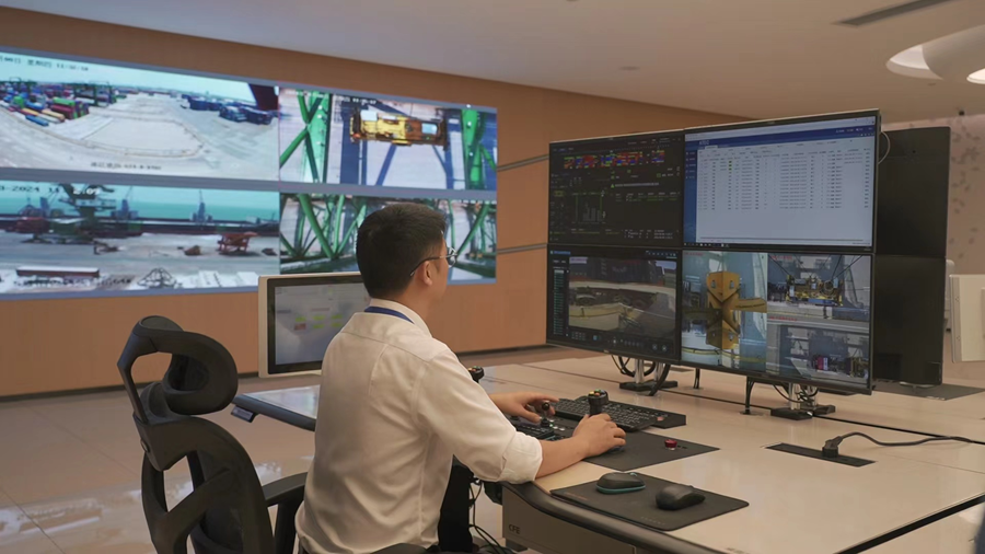 “操作员正在数智中心远控室里操作着轨道吊这样的‘庞然大物’。”福州新港国际集装箱码头有限公司副总经理程翔介绍,江阴港区应用先进的AI视觉技术,通过整机的68个摄像头和AI、自动控制等技术,赋予轨道吊“最强大脑”,可以全天候对装卸作业进行监测,在提升工作安全性的同时,也大大地提升了工作效率。