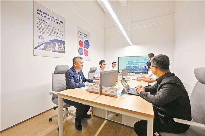 俄罗斯地区服务中心里,涉外律师为企业提供咨询;在阿拉伯地区服务中心,一场会议正在热烈进行中;国际海事事务与区域合作融合发展研究中心里,工作人员则在电脑前,敲打着键盘……走进位于海上世界的海丝国际法商融合服务基地,浓郁的国际化气息扑面而来。