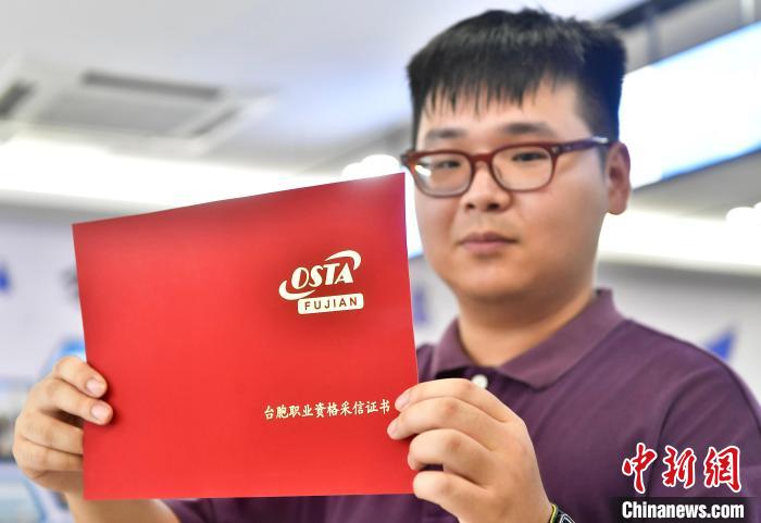 9月25日,台胞展示在一体化中心办理的台胞职业资格采信证书。张斌/摄