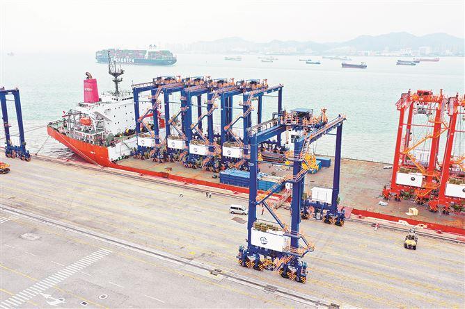 2023年4月23日,载有12台龙门吊的船舶停靠嵩屿码头,厦门港一次性新增12台全智能化轮胎式龙门吊全部到港。