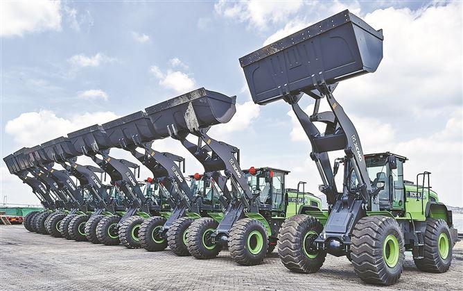 全新的纯电动装载机,在厦门港石湖山码头一字排开。