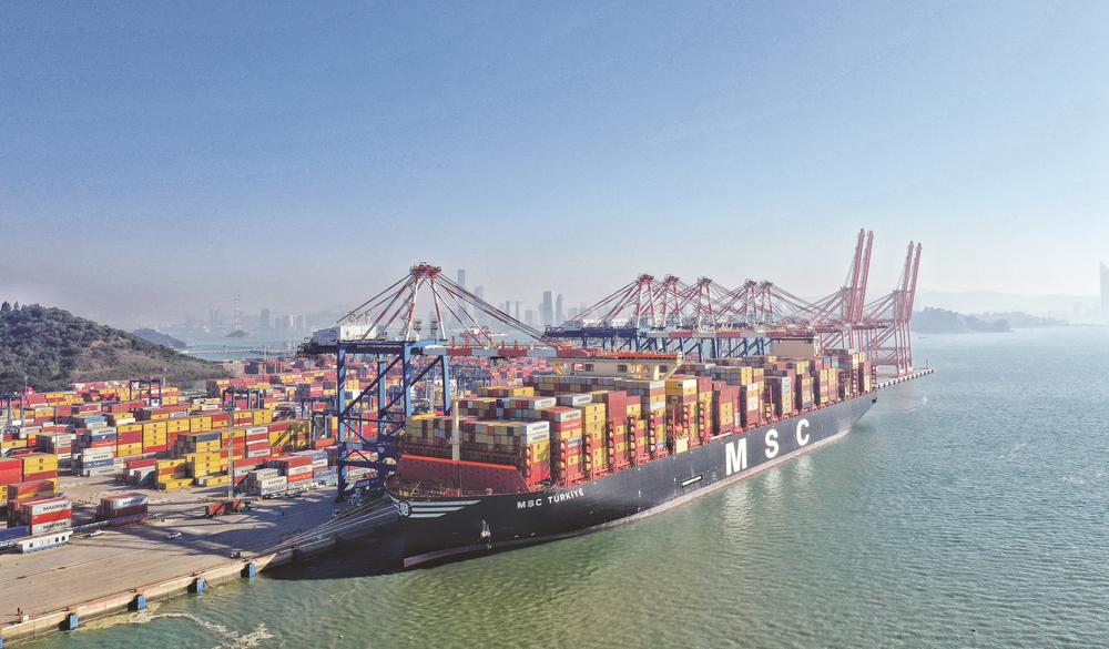 20万吨级集装箱船舶“地中海土耳其”轮靠泊厦门港嵩屿码头。(厦门海关供图)