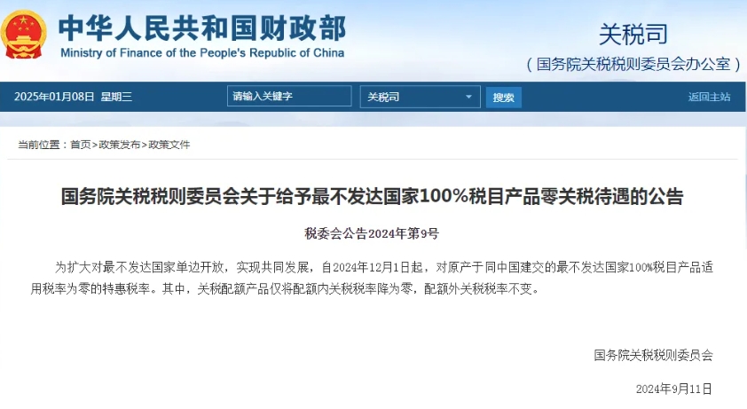 根据《国务院关税税则委员会关于给予最不发达国家100%税目产品零关税待遇的公告》,自2024年12月1日起,对原产于同中国建交的最不发达国家100%税目产品适用税率为零的特惠税率(以下简称“特惠”)。