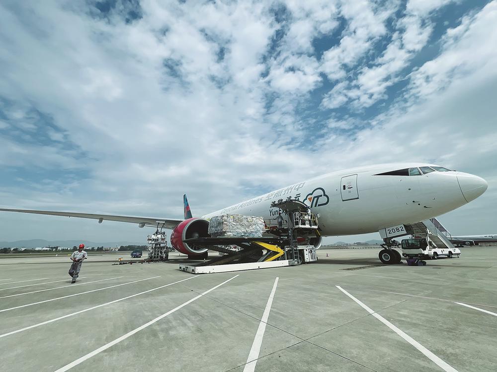 2025年4月17日,福州—巴黎洲际全货机航线开通,波音B777-200F货机正在装载货物。陈欢欢 摄