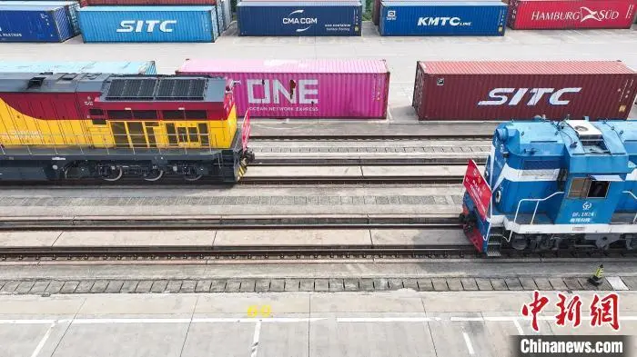 图为4月29日,江西南昌国际陆港,一列从厦门港驶来的铁海联运班列与另一列满载江西本土制造产品奔赴厦门港的铁海联运班列在南昌国际陆港交会。张正仁 摄